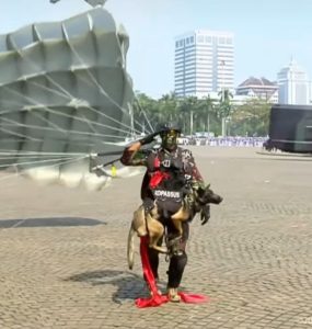 Kedua penerjun itu berhasil mendarat dengan presisi di depan mimbar kehormatan, disusul gelombang penerjun berikutnya dari Detasemen Khusus Penanggulangan Teror (Satgultor) 81/Kopassus TNI AD.