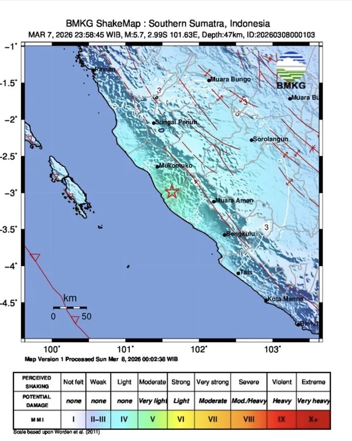 Informasi awal BMKG menyebutkan bahwa gempa tersebut memiliki koordinat 2,99 Lintang Selatan dan 101,63 Bujur Timur dengan kedalaman sekitar 47 kilometer.
