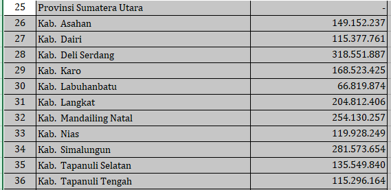 Posisi kedua ditempati Deli Serdang dengan Rp318,55 miliar, disusul Simalungun sebesar Rp281,57 miliar.