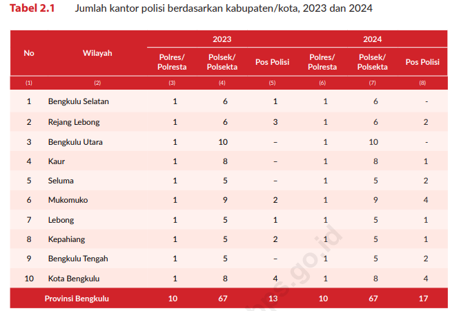 Berdasarkan data resmi, jumlah Polres/Polresta dan Polsek/Polsekta di Bengkulu tidak mengalami perubahan signifikan.