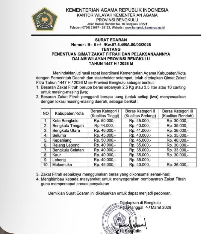 Ketentuan ini menjadi pedoman bagi masyarakat Muslim di seluruh kabupaten dan kota di Provinsi Bengkulu dalam menunaikan kewajiban zakat fitrah menjelang Idulfitri.