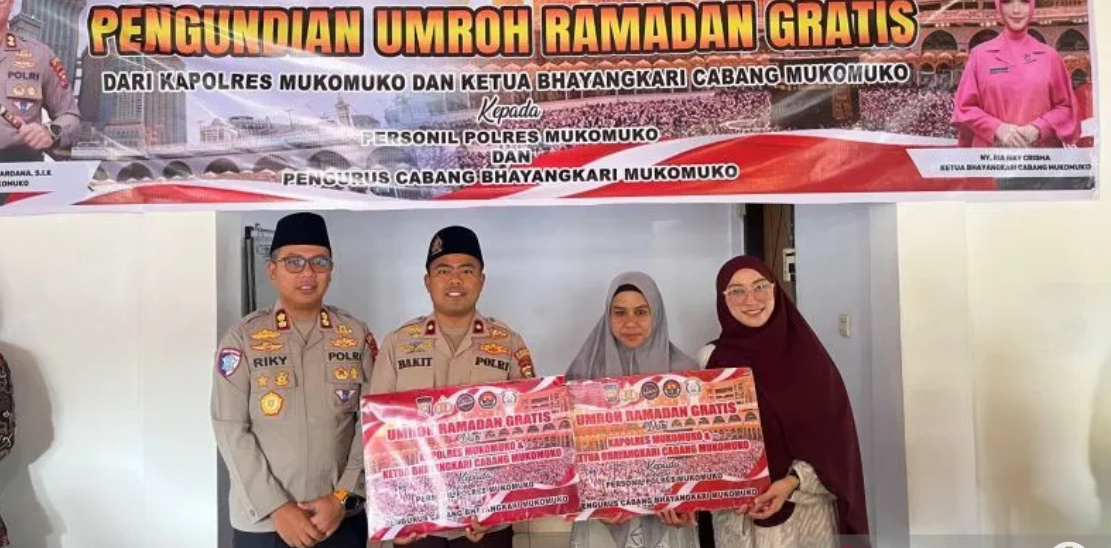 MUKOMUKO, RBMEDIA.ID – Kepala Kepolisian Resor (Kapolres) Mukomuko, Provinsi Bengkulu, AKBP Riky Crisma Wardana bersama istri menggelar undian umroh Ramadan gratis bagi seluruh personel Polres Mukomuko dan pengurus Bhayangkari.