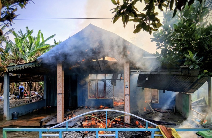 Api yang diduga berasal dari korsleting listrik dengan cepat membesar dan melahap seluruh bagian rumah, sehingga pemilik tidak sempat menyelamatkan harta benda di dalamnya.
