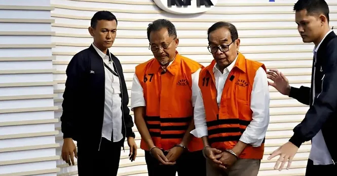 Mantan Direktur Utama PT Hutama Karya (HK) (Persero) Bintang Perbowo (kedua kanan) bersama mantan Kepala Divisi Pengembangan Bisnis dan Investasi PT HK (Persero) M Rizal Sutjipto (kedua kiri) dikawal petugas KPK (Instagram-duniahariini17)
