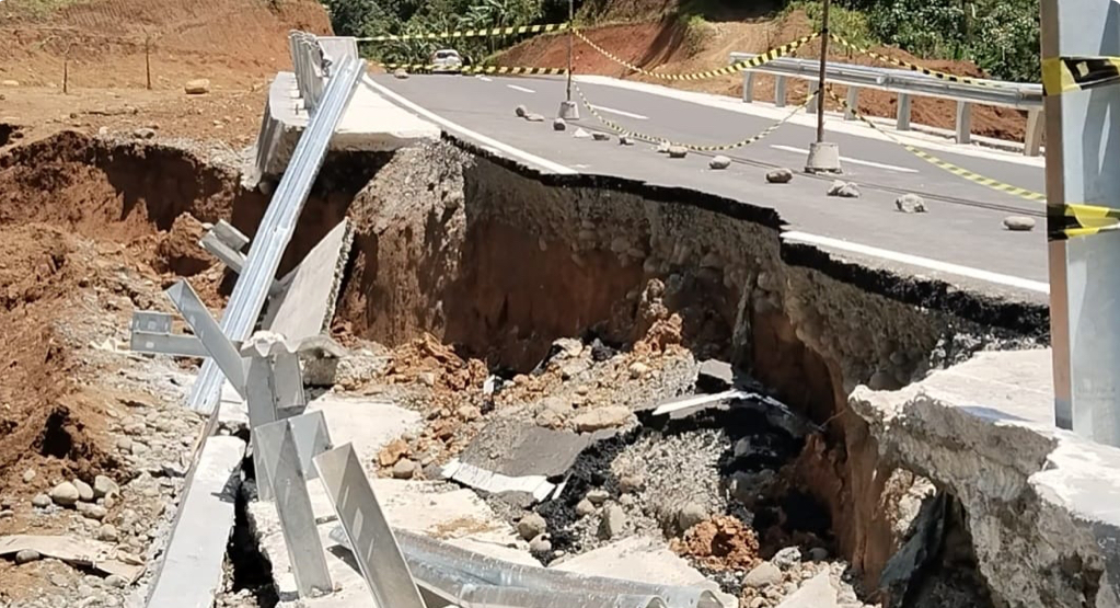 Sebagian bahu jalan ikut terkikis, sementara beberapa tiang pembatas ambruk akibat longsoran tanah di bawah permukaan aspal.