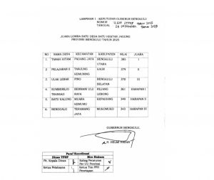 Berdasarkan keputusan gubernur, Desa Tanah Hitam, Kecamatan Padang Jaya, Kabupaten Bengkulu Utara berhasil keluar sebagai juara pertama.