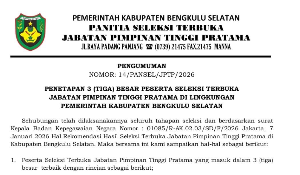 BENGKULU SELATAN, RBMEDIA.ID – Panitia Seleksi Terbuka (Selter) Jabatan Pimpinan Tinggi Pratama (JPTP) di lingkungan Pemerintah Kabupaten Bengkulu Selatan resmi mengumumkan peserta yang masuk tiga besar terbaik.